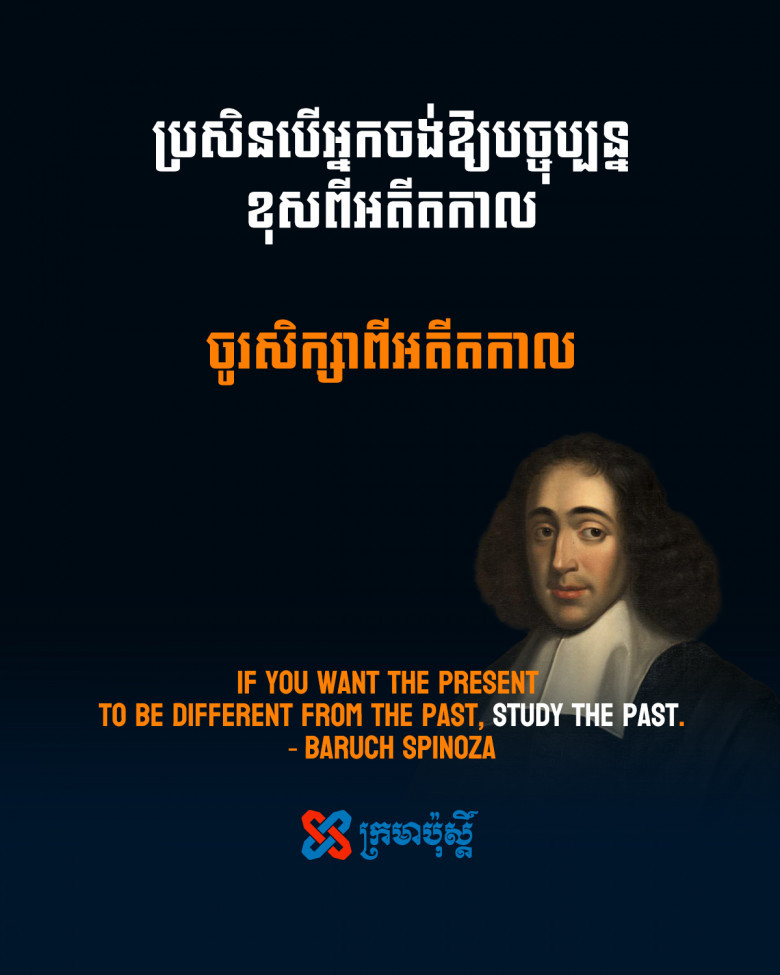 Baruch Spinoza - If you want the present to be different from the past, study the past Jennah posted on 2 years ago — updated on 2 years ago ខ្លី សង្គម ទស្សនៈ អតីតកាល អ្នកប្រាជ្ញ