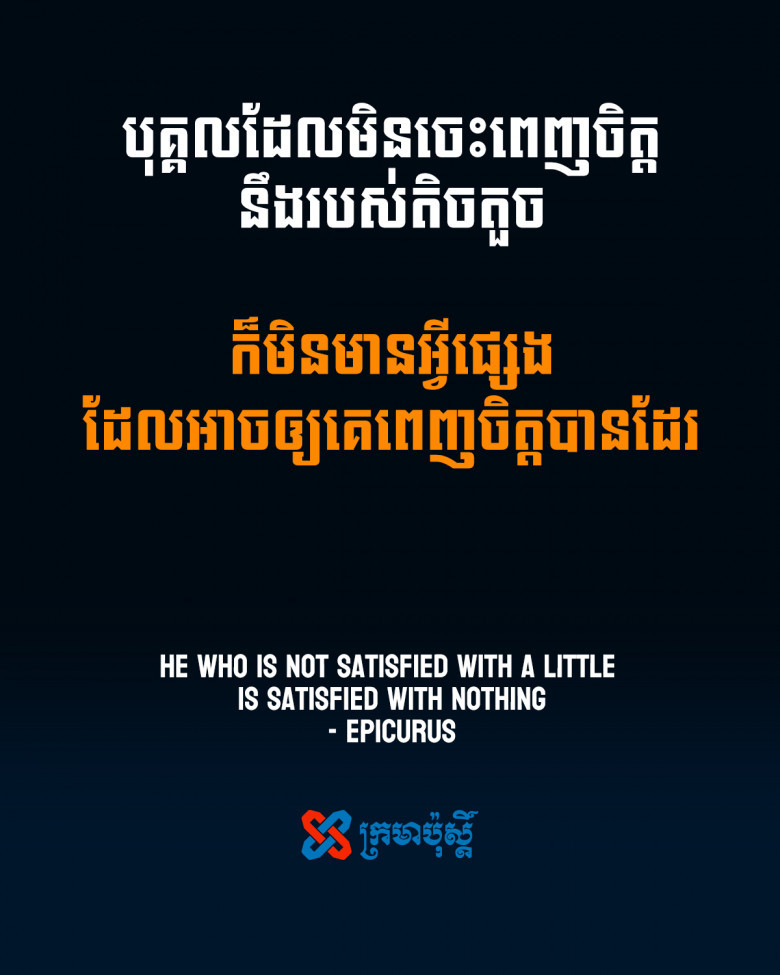 Epicurus - He who is not satisfied with a little is satisfied with nothing Jennah posted on 2 years ago — updated on 2 years ago ខ្លី សង្គម ទស្សនៈ ការពេញចិត្ត