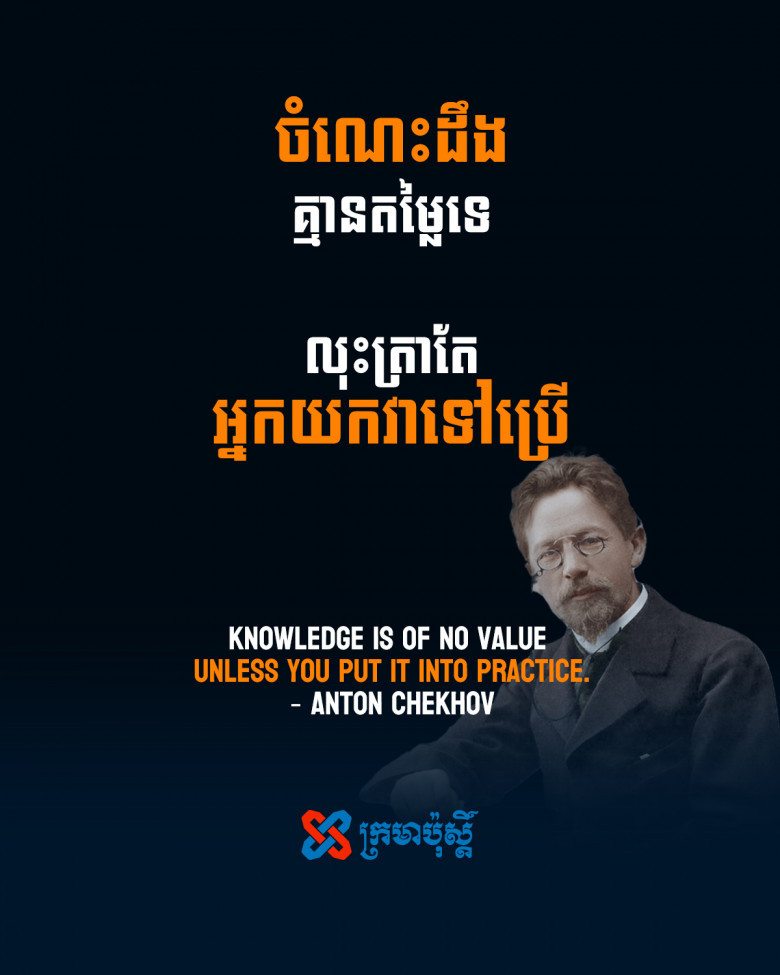 Anton Chekhov - Knowledge is of no value unless you put it into practice Jennah posted on 2 years ago — updated on 2 years ago ខ្លី សង្គម ចំណេះដឹង ឃ្លាខ្លី ទស្សនៈ