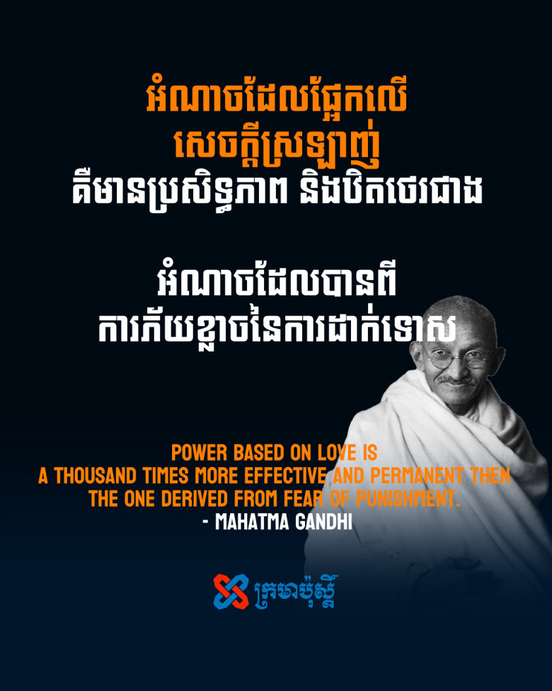 Mahatma Gandhi - Power based on love is a thousand times more effective and permanent then the one derived from fear of punishment. Jennah posted on 2 years ago — updated on 2 years ago ខ្លី សង្គម ទស្សនៈ អ្នកដឹកនាំ អំណាច ក្ដីស្រលាញ់