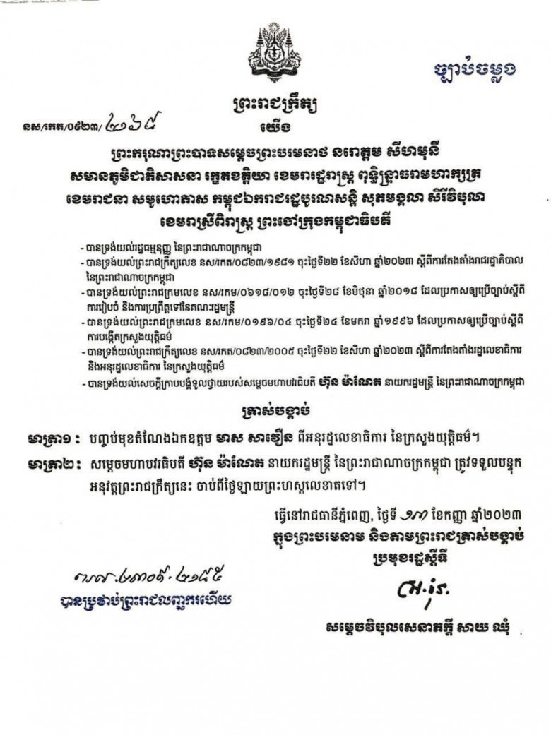 បញ្ចប់តំណែងលោក មាស សាវឿន ពីអនុរដ្ឋលេខាធិការក្រសួងយុត្តិធម៌ botr Editor posted on 2 years ago សង្គម ក្រសួងយុត្តិធម៌ អនុរដ្ឋលេខាធិការ