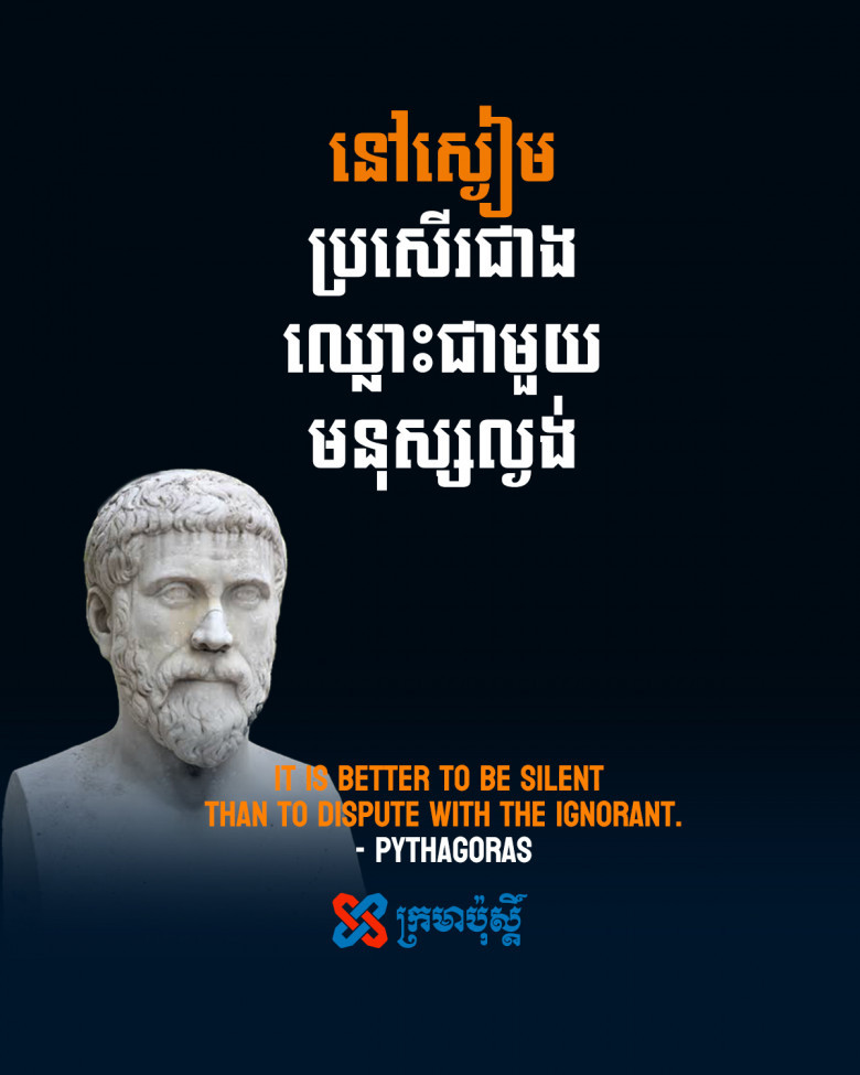 Pythagoras - It is better to be silent than to dispute with the ignorant. Jennah posted on 2 years ago — updated on 2 years ago ខ្លី សង្គម អ្នកប្រាជ្ញ ទស្សនៈ