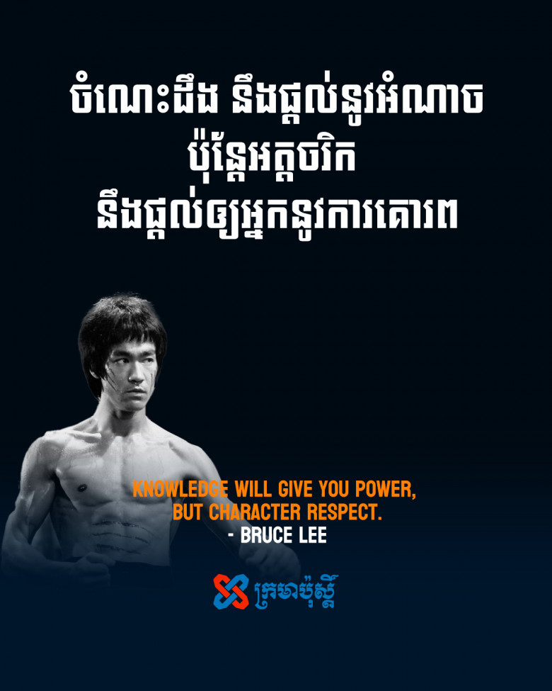 Bruce Lee - Knowledge will give you power, but character respect. Jennah posted on 2 years ago — updated on 2 years ago ខ្លី សង្គម ទស្សនៈ ការអប់រំខ្លី អត្តចរិក អំណាច