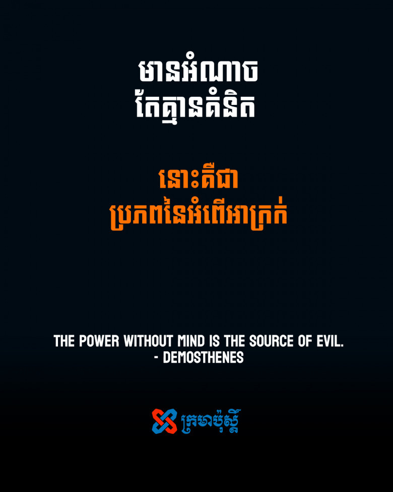 Demosthenes - The power without mind is the source of evil Jennah posted on 2 years ago — updated on 2 years ago ខ្លី សង្គម អំណាច អំពើអាក្រក់ ទស្សនៈ