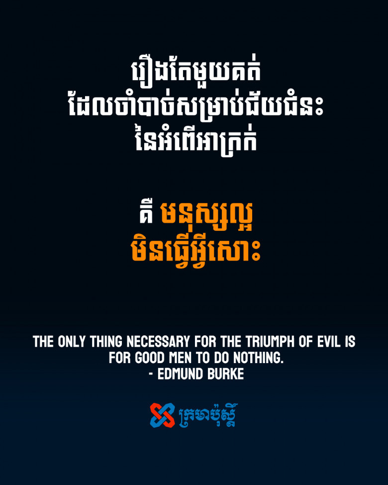 Edmund Burke - The only thing necessary for the triumph of evil is for good men to do nothing Jennah posted on 2 years ago — updated on 2 years ago ខ្លី សង្គម អំពើអាក្រក់ ទស្សនៈ ជ័យជំនះ