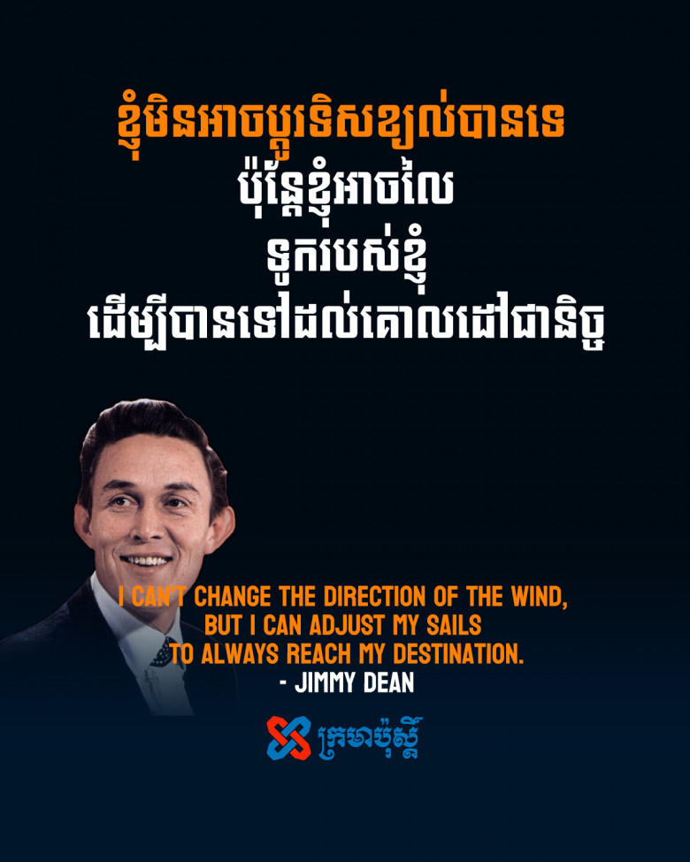 Jimmy Dean - I can't change the direction of the wind, but I can adjust my sails to always reach my destination. Jennah posted on 2 years ago — updated on 2 years ago ខ្លី សង្គម ទស្សនៈ ទិសខ្យល់ គោលដៅ