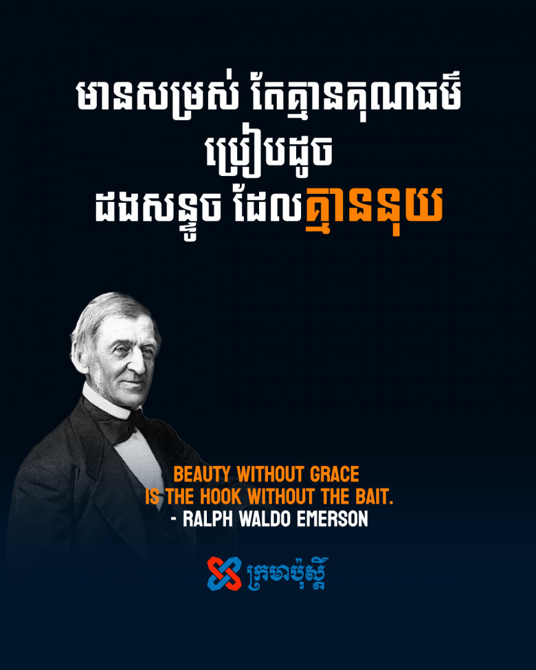 Ralph Waldo Emerson - Beauty without grace is the hook without the bait. Jennah posted on 2 years ago — updated on 2 years ago ខ្លី សង្គម ទស្សនៈ សម្រស់ អ្នកនិពន្ធ
