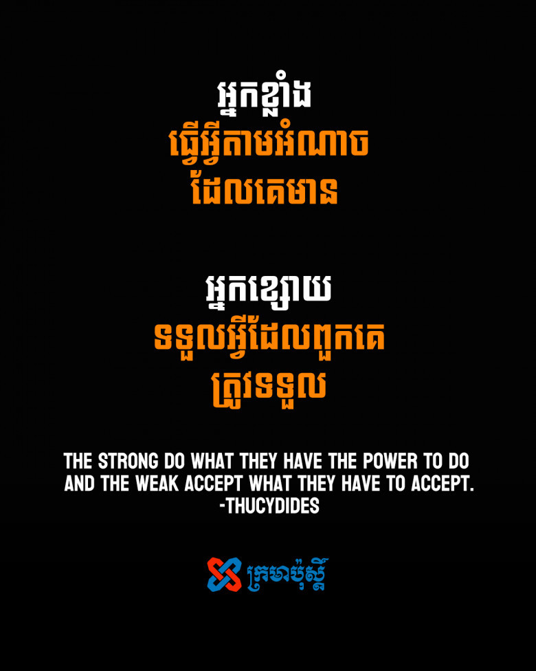 Thucydides - The strong do what they have the power to do and the weak accept what they have to accept Jennah posted on 2 years ago — updated on 2 years ago ខ្លី សង្គម ឃ្លាខ្លី ទស្សនៈ អំណាច