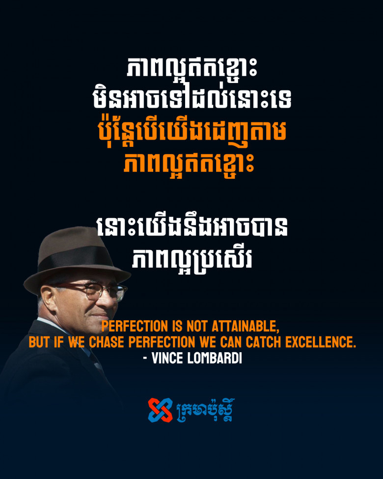 Vince Lombardi - Perfection is not attainable, but if we chase perfection we can catch excellence. Jennah posted on 2 years ago — updated on 2 years ago ខ្លី សង្គម ទស្សនៈ ការដេញតាម ភាពល្អឥតខ្ចោះ