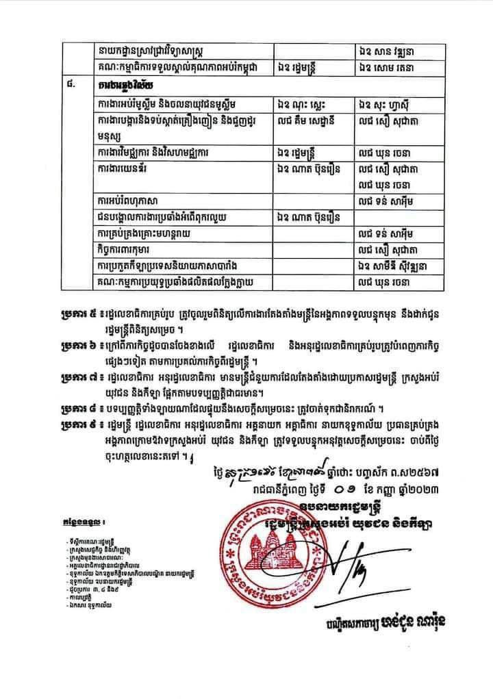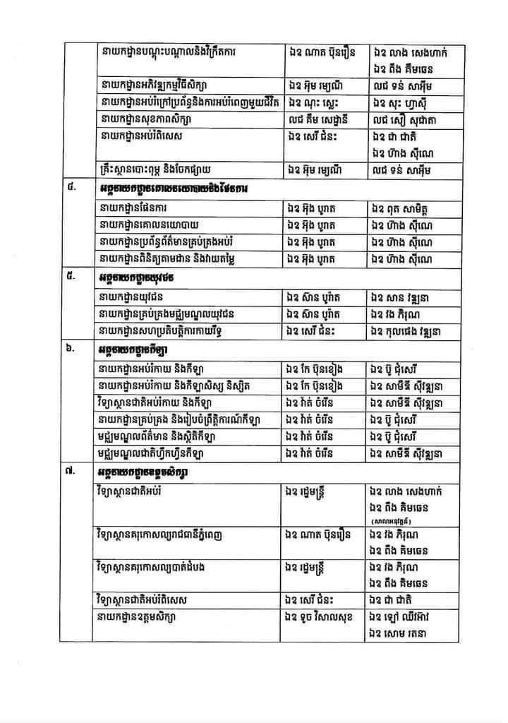 សេចក្តីសម្រេច ស្ដីពី ការកំណត់របៀបការងារ និងការបែងចែកភារកិច្ចរបស់ថ្នាក់ដឹកនាំ ក្រសួងអប់រំ យុវជន និងកីឡា botr Editor posted on 2 years ago សង្គម ការបែងចែកភារកិច្ច ក្រសួងអប់រំ